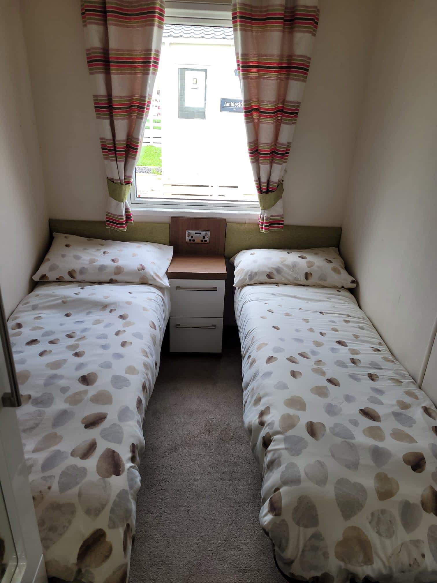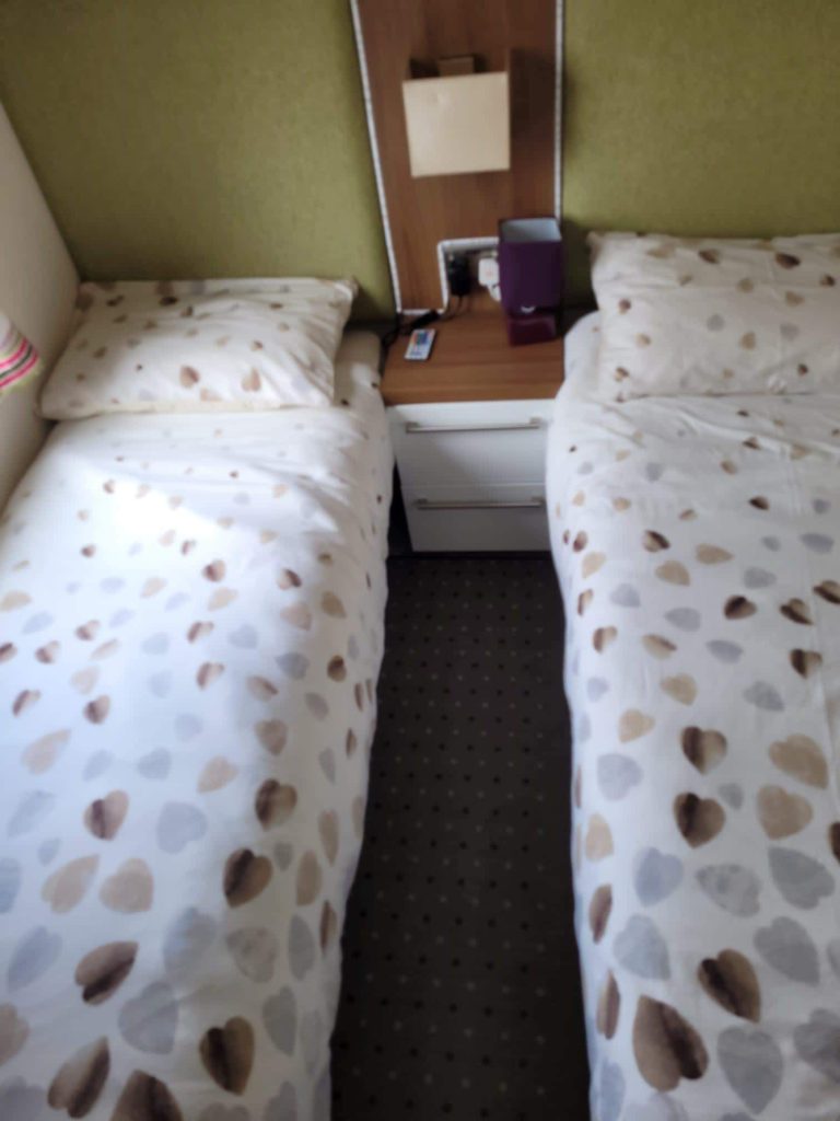 Two separate twin bedroom with 2 single Beds,Wardrobe, and Bedside Table with Shelving, and the all important family bathroom with large Shower, WC and Basin with underneath Cupboards, Mirror on the wall.